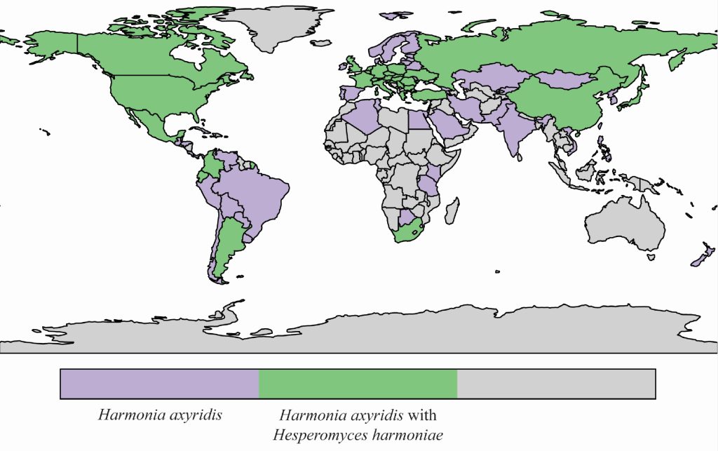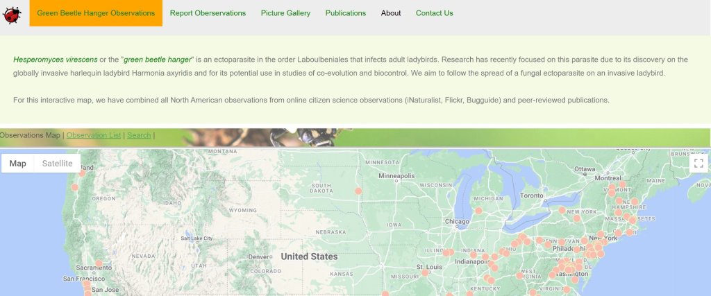 Our Beetlehangers paper was finally published in a special issue of Arthropod-Plant Interactions! This project has been ongoing since 2017 when Danny met two high school students Fred and Jeff Pan and their mother Fang Yu. The four of us started working on a dataset of – at that time – Hesperomyces virescens records from the invasive alien ladybird Harmonia axyridis in North America and developed a precursor version of the current website, https://beetlehangers.org/. Records came from the literature and from online citizen science data portals, including iNaturalist.