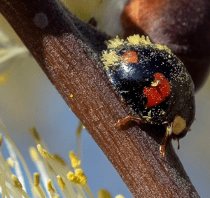 Hesperomyces is a very small parasitic fungus that attaches to the outside of ladybirds. They are part of a group of fungi called the Laboulbeniales, all of which attach themselves to arthropods. Unlike most fungi, Laboulbeniales don’t form a thread-like mycelium. Hesperomyces looks like a small, yellow-green, banana-shaped structure dangling from the ladybird. These structures, called thalli, are filled with spores, which shoot from their tip when the fungus is disturbed, like when the ladybirds are mating. The spores then land on a new host, and grow a new thallus there. It’s possible to see Hesperomyces with the naked eye. It is also easy to spot when taking zoomed-in photographs. However, loupe may help see the smaller immature thalli. You can find them on a large variety of ladybirds.